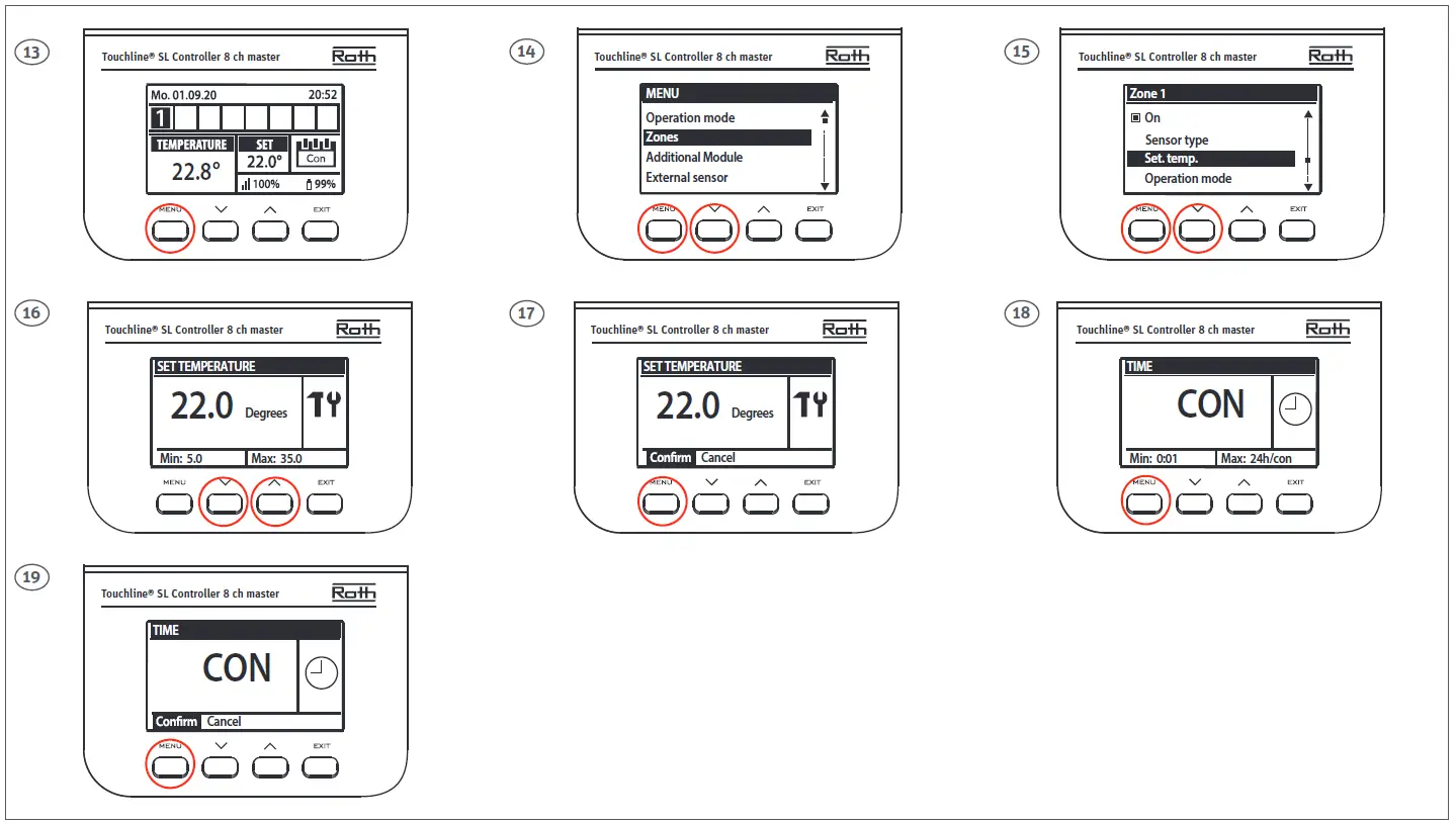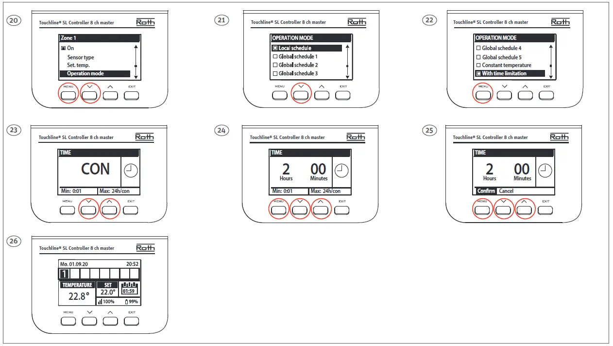 - If you want a different drive type than constant temperature (CON), for example time programs or time limitation, follow the below steps 20 – 26 For more information about time programs, we refer to the online manual for the Roth Touchline® SL control unit – master.
