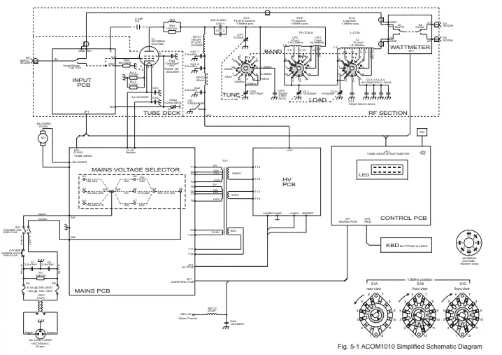 See Fig. 5-1 ACOM1010 Simplified* Schematic Diagram. The 4CX800A (GU74B) Svetlana high performance ceramic-metal tetrode (V1) with plate dissipation of 800 W is grid-driven. The input signal from the RF INPUT jack is passed through a broadband input matching circuit, which consists of components on the INPUT PCB and includes the drive-power swamping resistor Rsw. This circuit tunes out the input capacitance of the tube. The swamping resistor Rsw is a termination load for the matching circuit and can dissipate up to 80 W of RF drive power. It also eliminates any tendency toward oscillation by the tube, ensuring excellent RF stability of the amplifier.