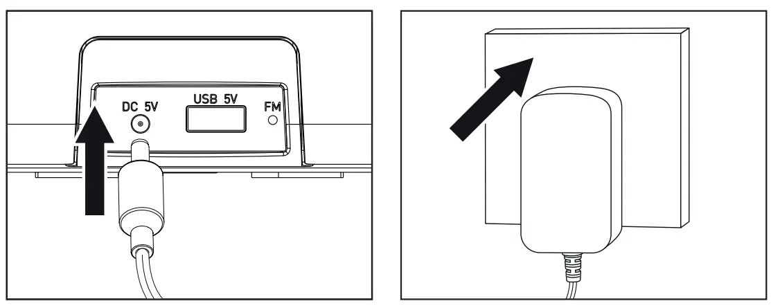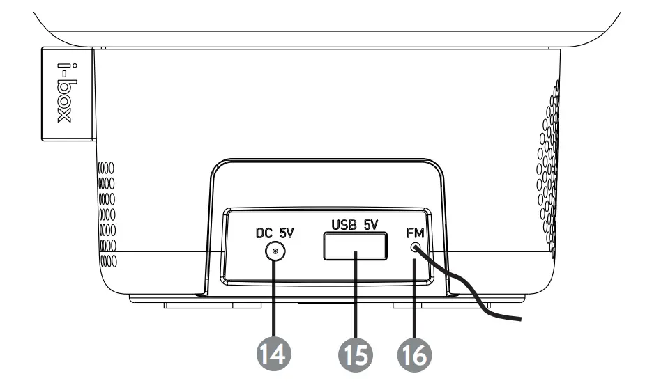 To power the i-box Ambe alarm clock, plug the power adaptor (supplied) into a wall socket and the jack plug into the DC In port on the back of the Ambe (14)
