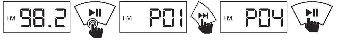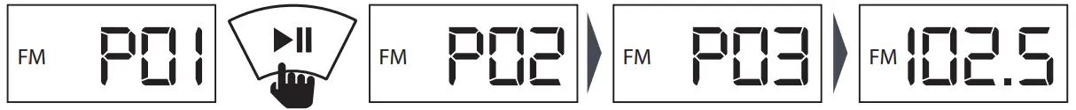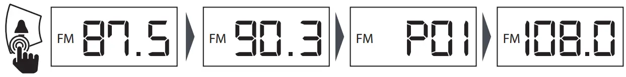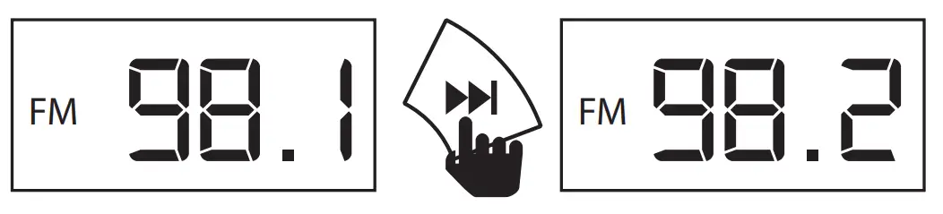Press the Mode button to switch to FM radio mode, the display will show ‘FM’ then will display the current frequency