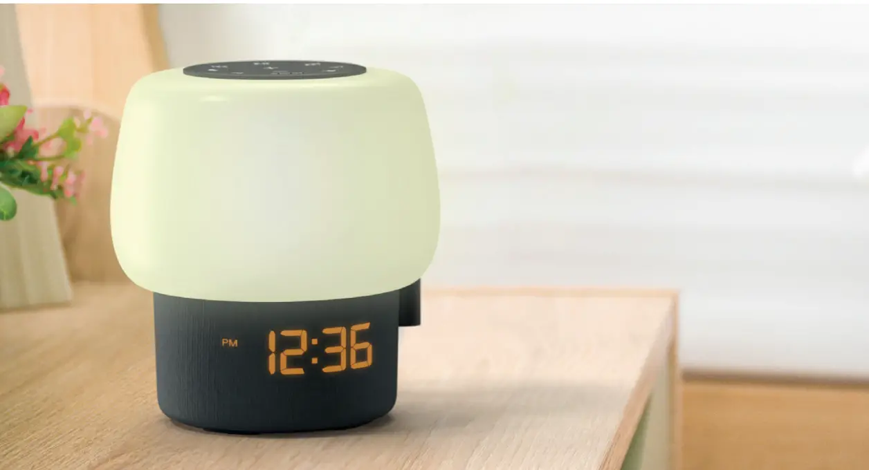 When it’s time for bed you can set the sleep/sunset timer to gradually dim the lamp and to switch off the radio (if it’s playing) after the time period you have set.