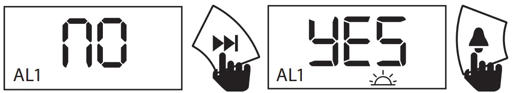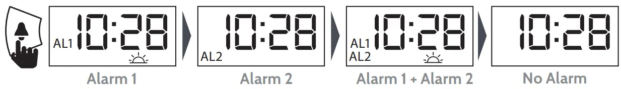 To activate or deactivate any alarms, while in Standby Mode, short press the Alarm Set key (4) repeatedly to cycle through the alarm set modes.