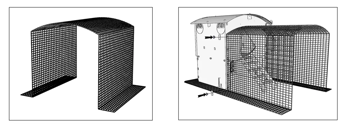 - Fit the left and right side mesh over the 30mm screws either side of the coop.