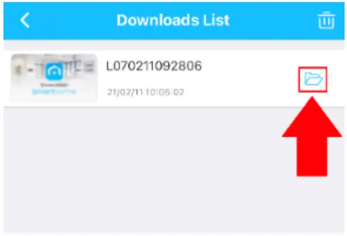), the app will begin to download the event. The downloaded event can be accessed in the Downloads List option of the app. To access the Downloads List menu, return to the main menu and tap on the Account option, and select Downloads List. The downloaded recording will be in this menu, tap on the Folder icon.