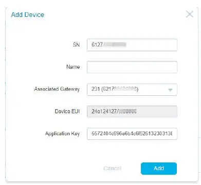 - Go to “Device->My Devices” and click “Add Device”. Fill in the SN of IOT-S500AM sensor and select associated gateway.