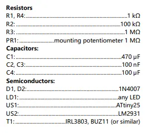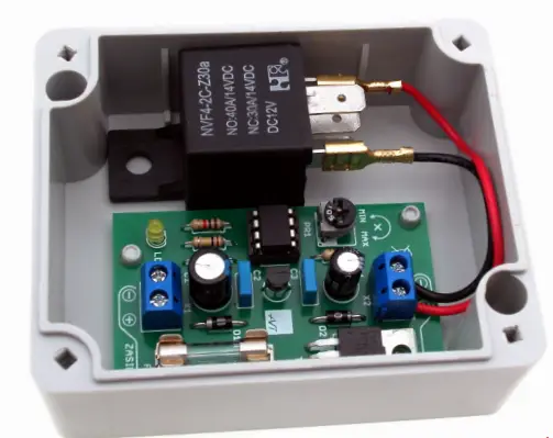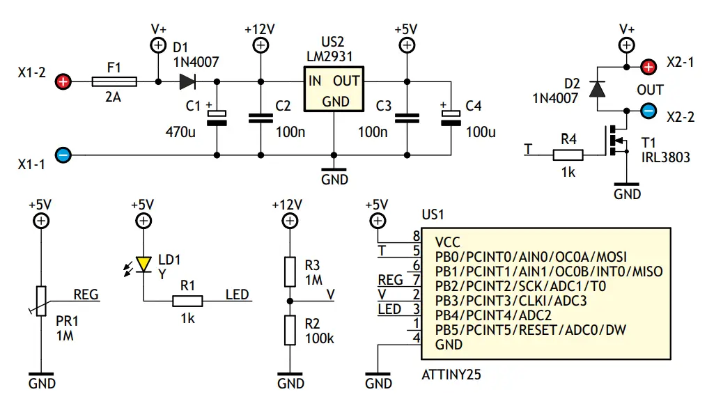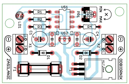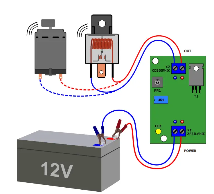 - Input voltage fed from screw connector X1 goes to US2 stabiliser. The D1 diode installed in series with the power supply protects the circuit from incorrect polarity of the input voltage. Capacities C1 … C4 act as a power filter. The LDO stabiliser was used to reduce current consumption. The system must be powered by a 12V battery, e.g. a gel battery or a stabilised power supply also with 12VDC. Current capacity of the power source used depends mainly on the receiver used. In this case, it is a car relay, so 250mA is enough with a spare. There is nothing stopping you from experimenting with a DC