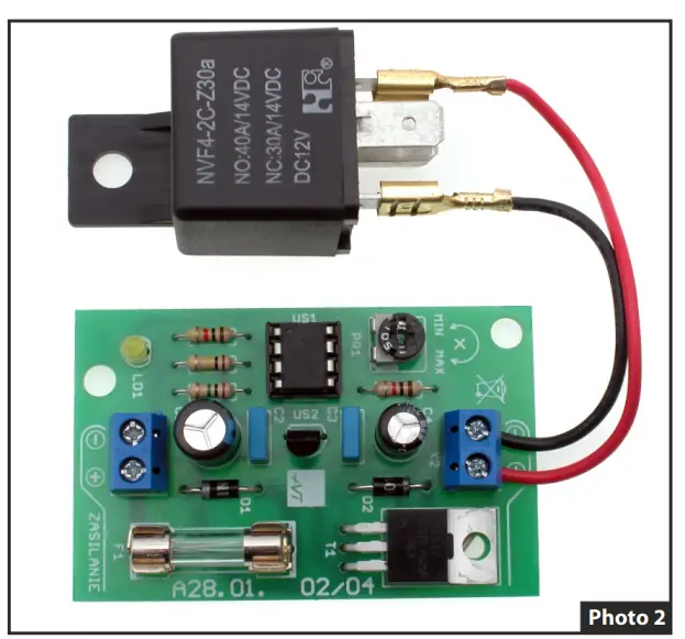 The circuit should be mounted on a board, the diagram of which is shown in Figure 2. Photo under the title and Photo 2 will facilitate mounting. All parts are mounted on a single-sided PCB size 40×63 mm. Start mounting the circuit by soldering resistors and other small components, and finish with screw terminals and inserting the US1 IC into the socket. If the device is to work with a vibrating relay, skip the socket during assembly and solder the microcontroller directly onto the board. Once the circuit has been assembled, check very carefully whether the components have been soldered in correct direction and in correct places, and if no short-circuits occurred at the soldering points. A mistake at this mounting stage can lead to component damage or even its explosion, this applies mainly to electrolytic capacitors.