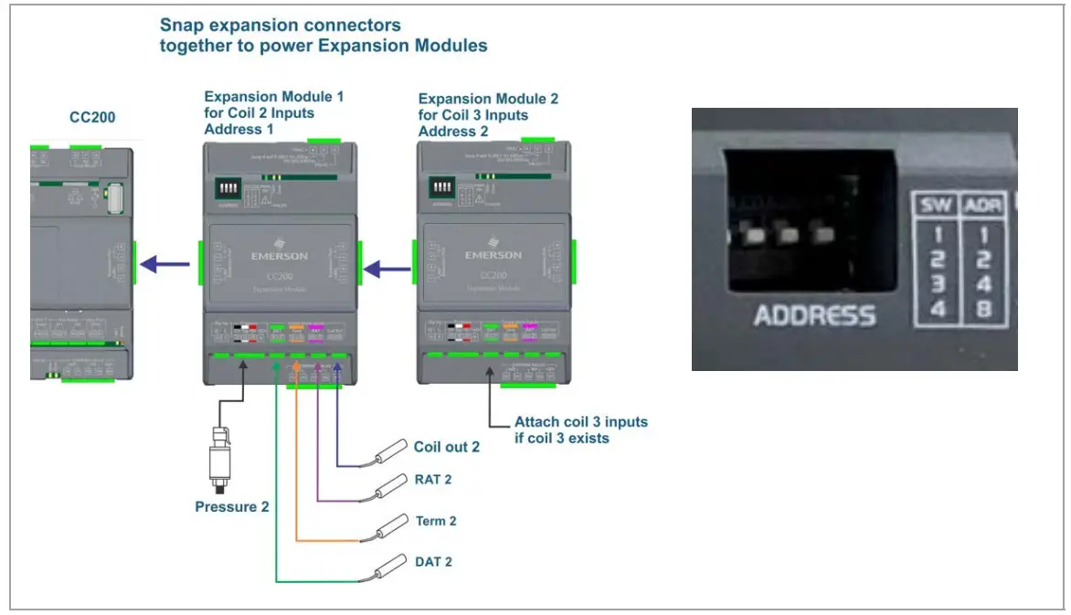 a. You will add an Expansion for a second or third coil. Each coil will have temp sensors and a transducer and will be wired to the respective Expansion Module. - Step 2: Addressing the Expansion Module