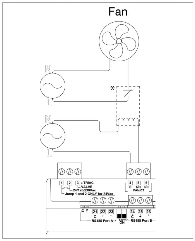| Fan/CT | Form C Relay/built in CT: NO: Resistive 5A, 240Vac or less Motor 5FLA, 30LRA, 240Vac or less Pilot Duty B300 NC: Resistive 5A, 240Vac or less Motor 5FLA, 30LRA, 240Vac or less Pilot Duty C300 | Evap Fans | 4(C) – 5(NO) – 6 (NC) |