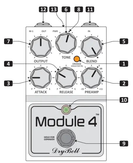 On the pedal’s front panel, you will find the dot marks around the knobs. When the control knobs are set to those dot marks and the ORANGE button is ON, Module 4 faithfully provides all the tonal flavors of the original. Also, those dots are a great starting point to explore the Module 4’s various possibilities.