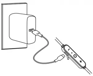 Fully charge your earbuds before first use. Before charging, make sure the earbuds are turned off. To charge, simply connect one end of the USB-A to C cable to a USB charging port and the other end to the input port on the earbuds. When the green LED indicator light turns off, your earbuds are fully charged and ready for use. Charging takes around 1.5 hours.