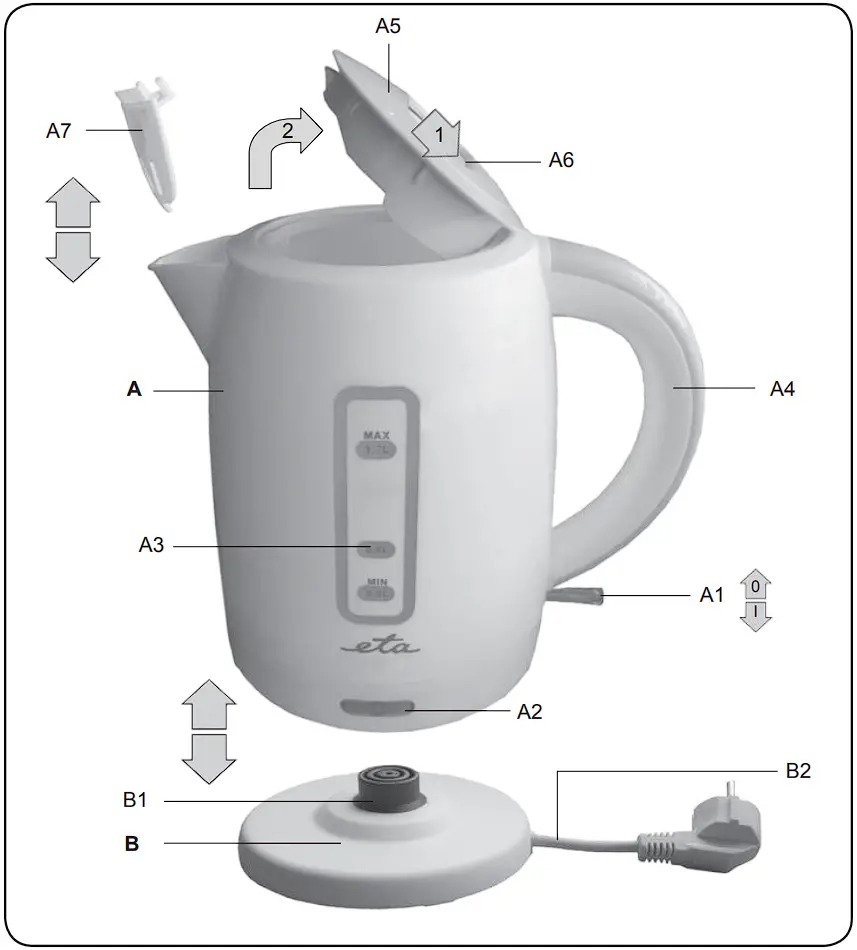 Function of the electric kettle is signaled with the control light A2. After boiling the appliance switches off automatically. Before reaching the boiling point, you can switch off the appliance by turning the A1 button to the 0 position. Always use fresh drinking water for boiling.