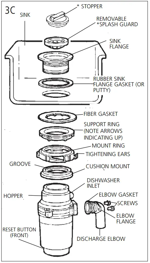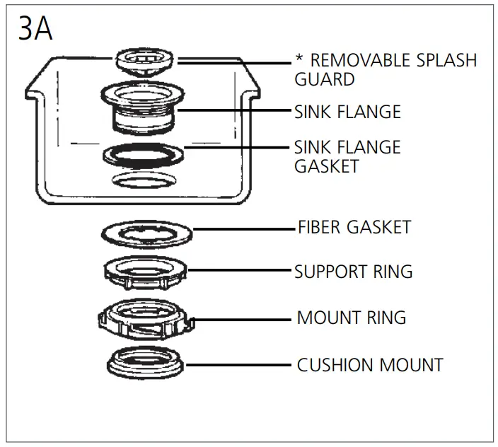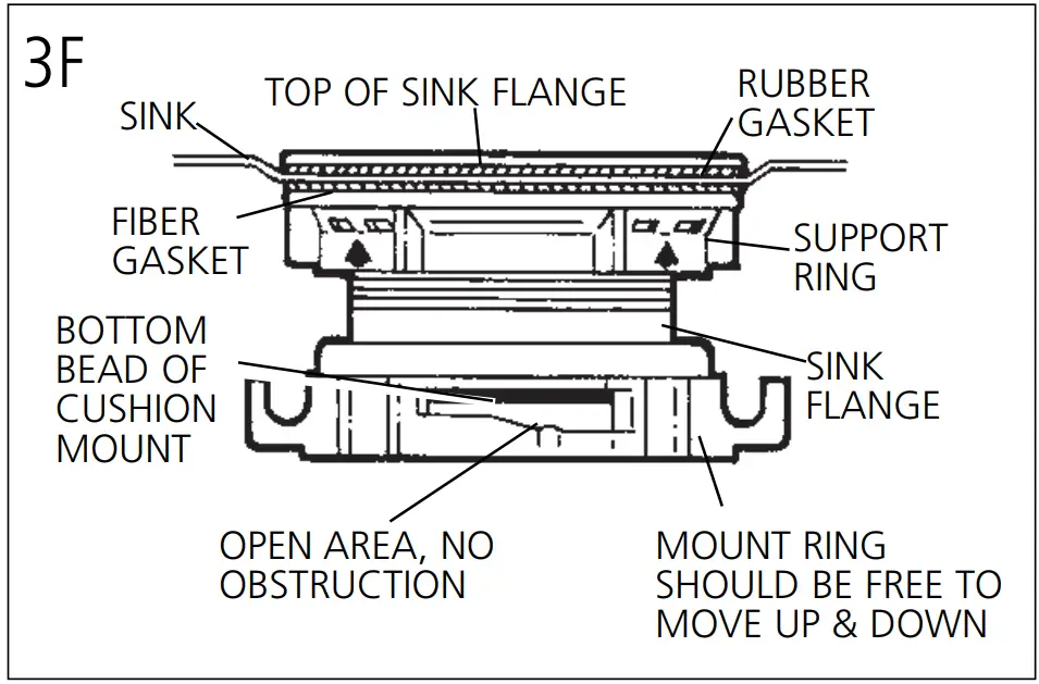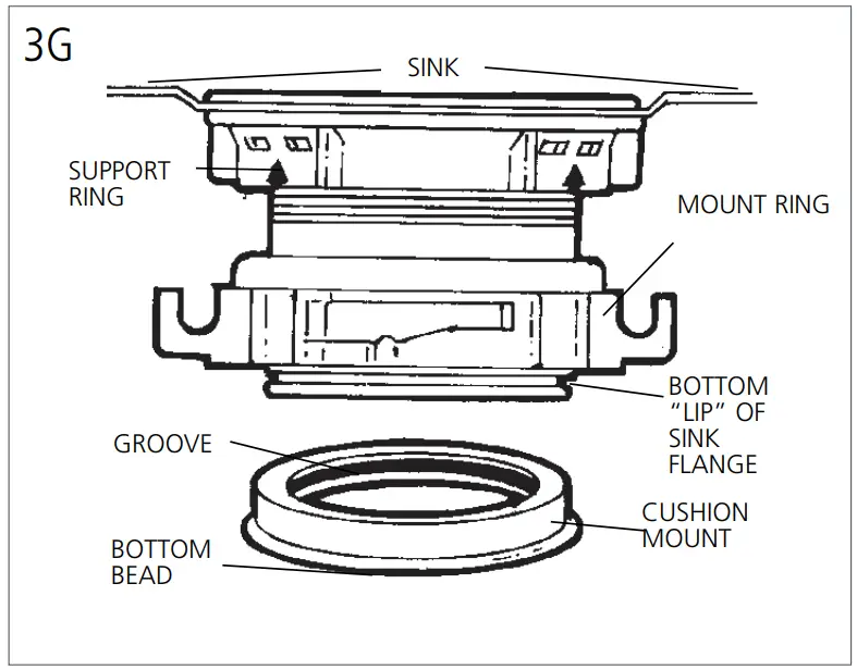When the cushion mount is installed correctly, the lip of the sink flange fits into the groove on the inside of the cushion mount and mount ring can be pulled downward over cushion mount and will be free to rotate. The bottom bead of the cushion mount acts as a gasket between the bottom of the sink flange and the top of the disposer. See illustration 3G.