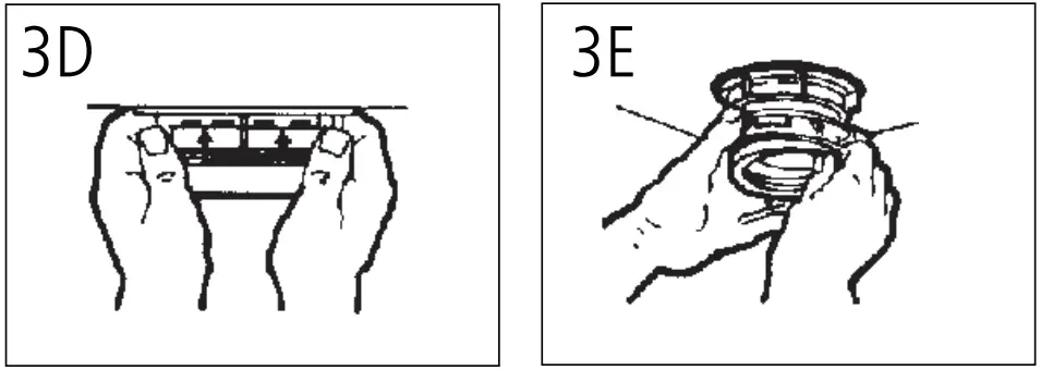 - Place mount ring over sink flange and hold in place while installing cushion mount (large side down) so the groove on the inside of cushion mount fits over lip on sink flange, similar to putting the lid on a plastic container (see 3E, 3F & 3G). Please read important notice below.