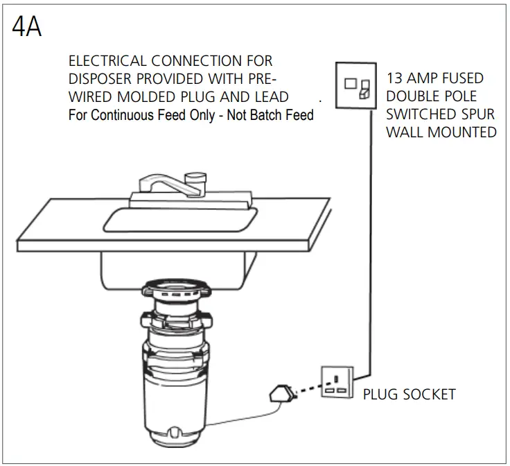This waste disposer is engineered to be connected For Continuous Feed Only – Not Batch Feed to a 220/240v~-50/60 Hz electrical supply through the attached three-pin plug and into a wired Socket. The disposer must be protected by a BS 1363 13Amp fuse. The fuse is included within the molded plug and lead, attached to the Disposer.