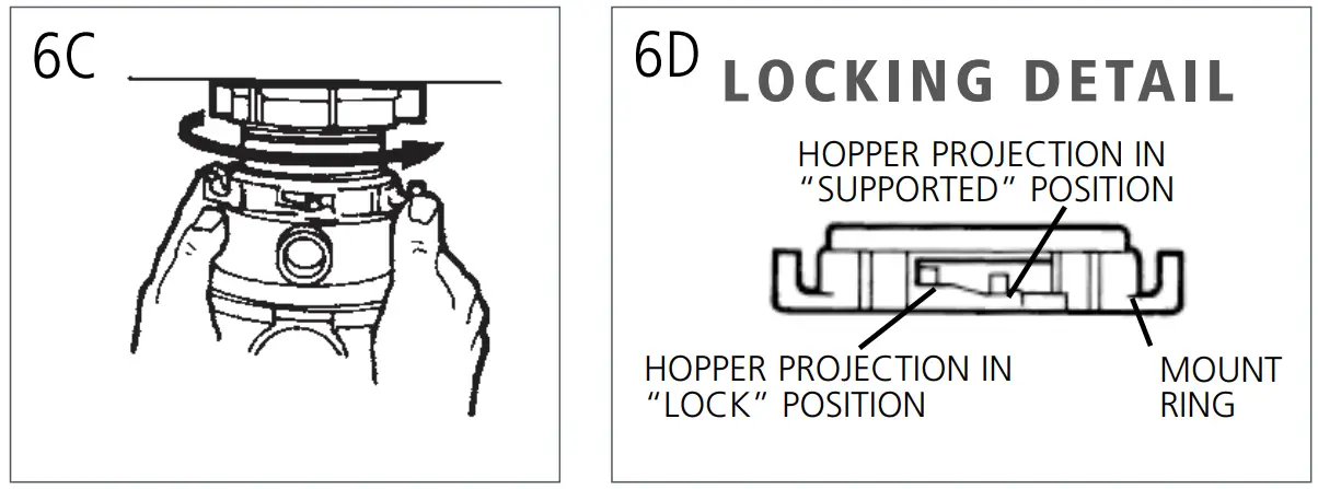- Turn mount ring to the right (counterclockwise) until it reaches the locking position as shown (6D). Hopper projections must be to extreme left of mounting slots (see 6C & 6D).