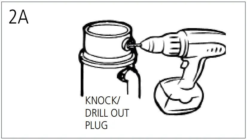 - Using a drill, drill out the entire plug, (see 2A). When knock out plug falls into disposer, you may remove it or grind it up when the disposer is used. This will not damage the disposer in any way, but may take some time to grind).