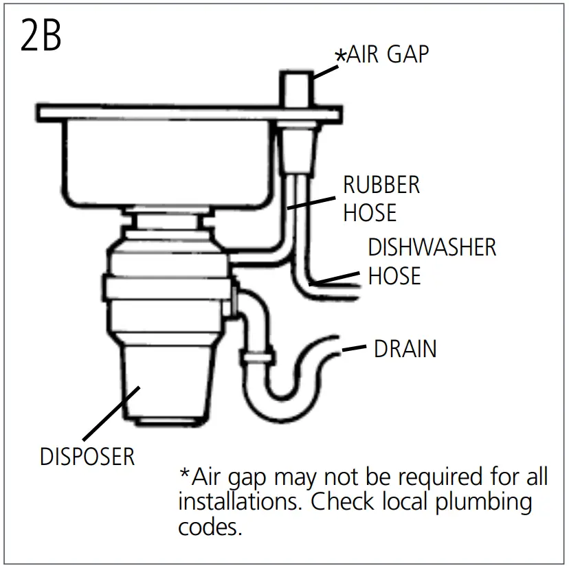 - Connect dishwasher hose (see 2B) using hose clamp. Make sure all plumbing connections are tight and in accordance with all plumbing codes and ordinances. Run water and check for leaks.