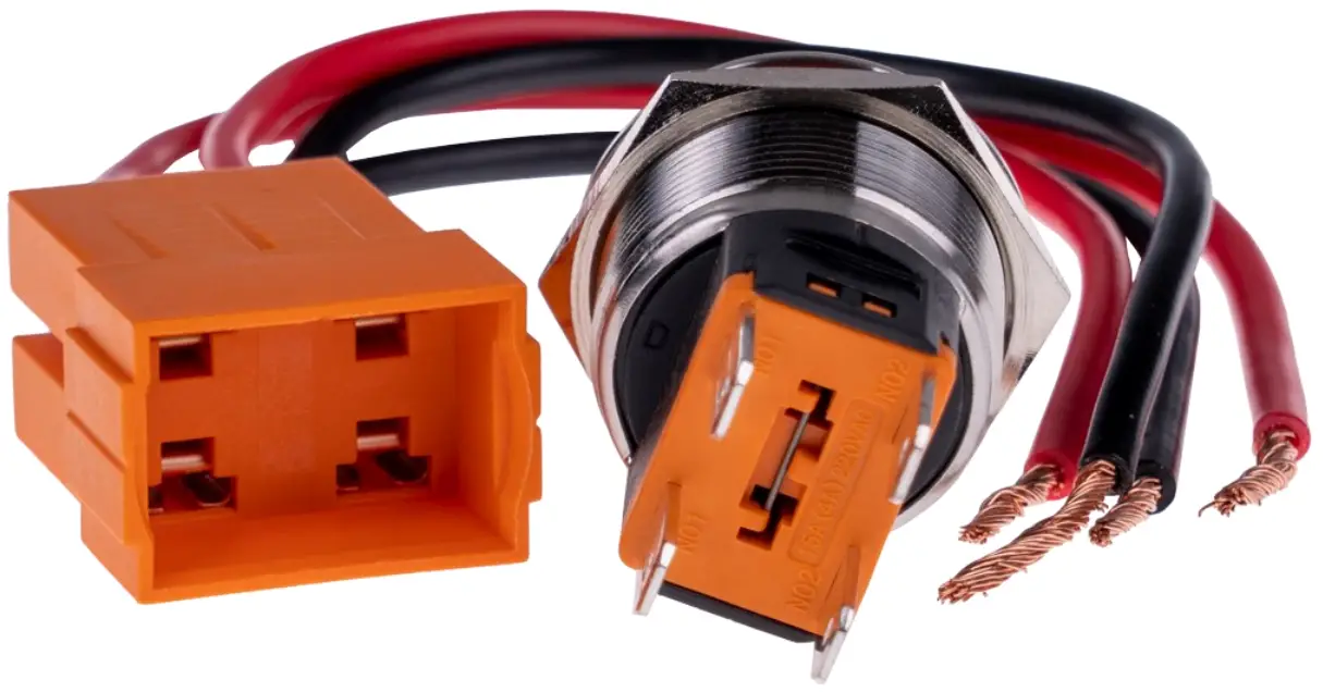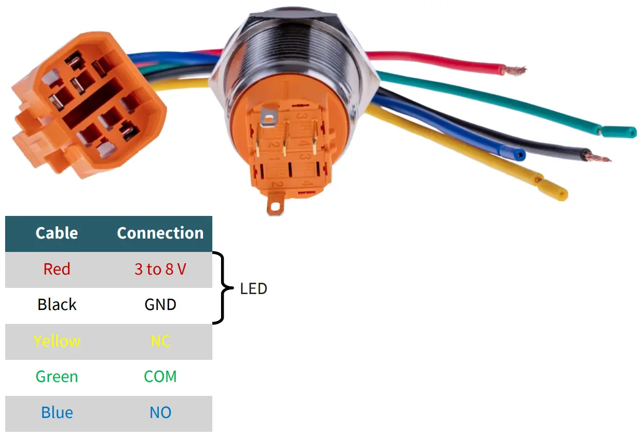 Attention! This button should only be used with max. 8 V DC! Higher voltages can cause damage to the built-in LED in the button, because it is connected to the power supply of the button.