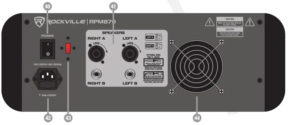 The 44″ TRS output connectors provide balanced or unbalanced line-level signals. Connect these to the next device in the signal chain like an external processor (compressor/limiter), or directly to the inputs of the main amplifier. This is the same signal that appears at the