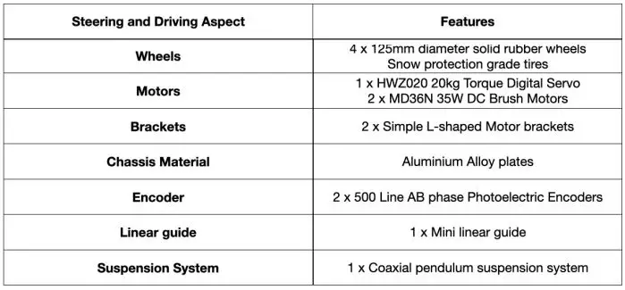 | Steering Gear | HWZ020 20kg torque digital servo | WH060 60kg torque digital servo | |