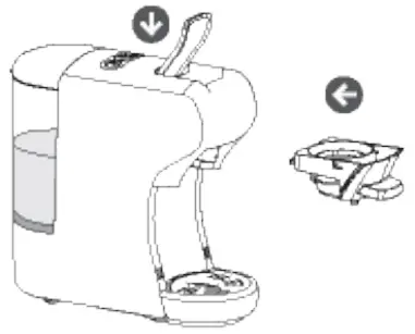 - Unplug the appliance and remove the water tank. Remove the capsules and capsule holders from the coffee maker and leave the drill lever down. Connect the plastic pump to the water inlet and remove the plunger.