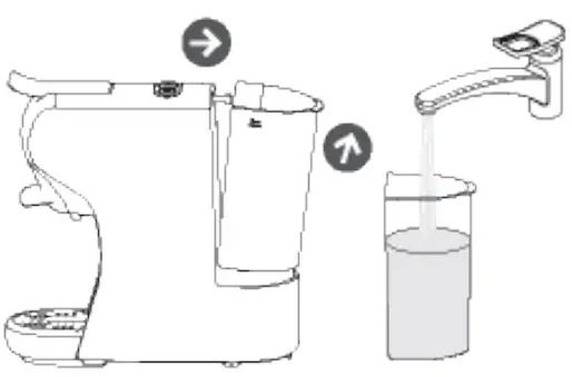 - Repeat the process to rinse the internal circuit with a tank of clean water (no decalcifying Liquid) to completely clean the internal circuit and ensure the good taste of your drinks.