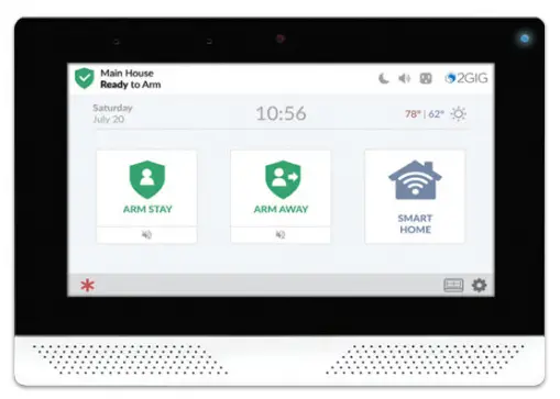 The Remote Keypad (2GIG-EDG-RK) is a wall-mounted, full-color, touch screen interface that provides all of the same easy-to-use keypad functions available on the Control Panel. It is designed for indoor use only and gives users the ability to arm and disarm the system, see the status of sensor zones, and control Smart Home devices.