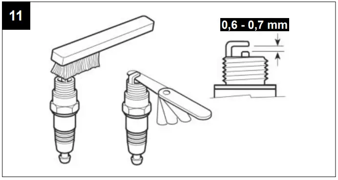 - Check the spark plug gap. An acceptable gap width is 0.6 to 0.7 mm (see Fig.11).