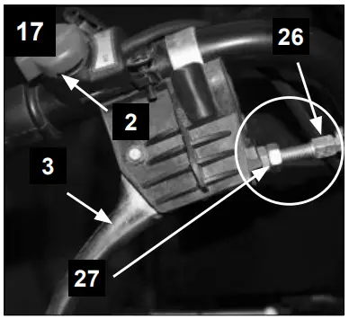 Slacken off the locknut (27) and unscrew the adjusters (26) to eliminate the play in the cable, which can occur after initial use or normal wear. Be very careful not to unscrew the adjusters (26) too much because this can create another problem: the loss of traction. Remember to tighten the locknut (27) when you have finished.