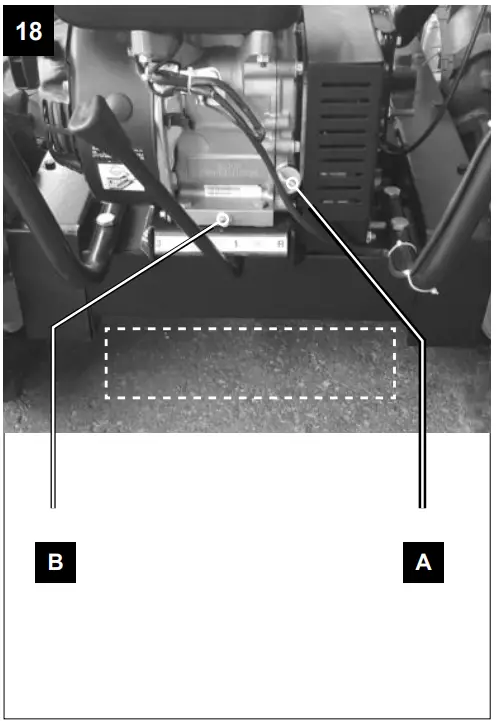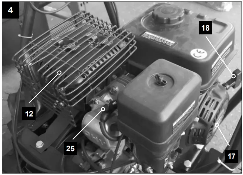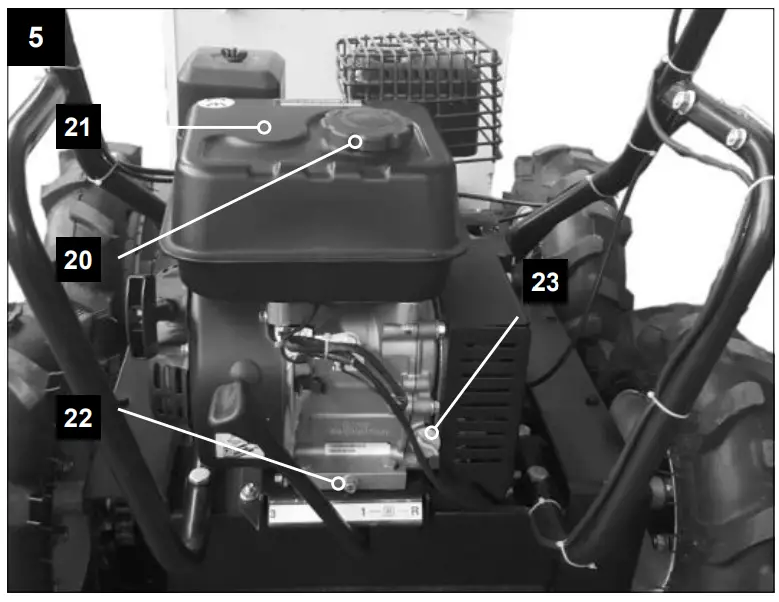 Check the oil level before each use. Remove the oil dipstick (23) and check the machine in horizontal position that the oil level is between the two marks. If necessary, add oil.