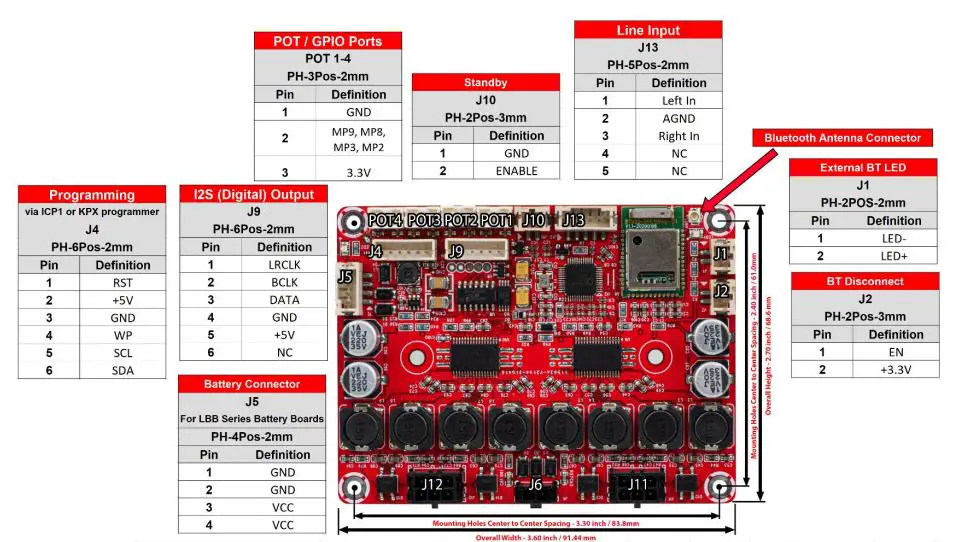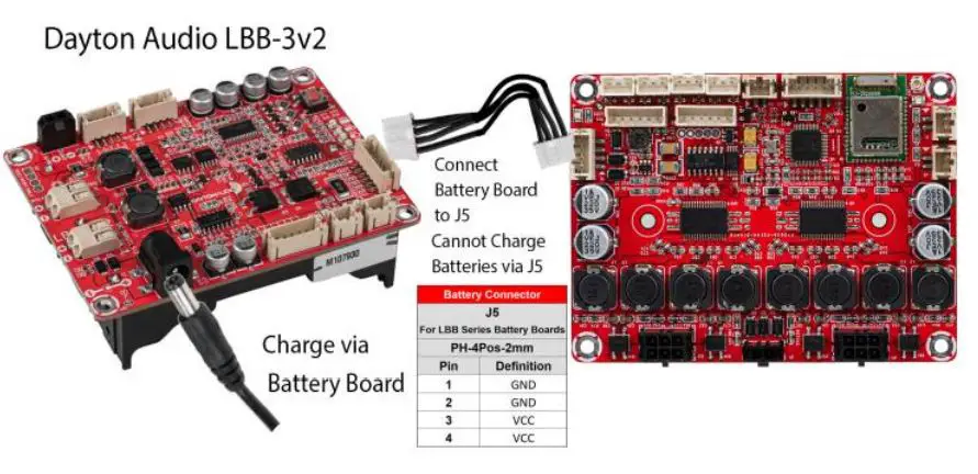 - Battery Power – The KABD-430 can also be easily powered with an external Dayton Audio battery board via J5. The KABD-430 does NOT have a battery charging circuit on the board, so the attached battery board must have this built in. Dayton Audio battery boards such as the LBB-3v2 (12V) or LBB-5Sv2 (21V) will work with any KABD series amplifier. Battery modules such as the Dayton Audio KAB-BE are not compatible with the KABD series because these battery modules do not have built in charging circuits (amplifiers such as the KAB250v4 have charging circuits on the board, but the KABD-430 does not have this circuit on the board).