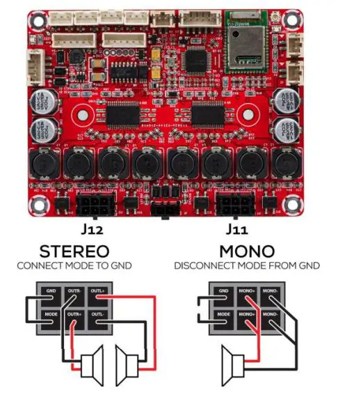 - The KABD-430 has 2 separate speaker output jacks (J11 and J12). These jacks are each attached to their own stereo amplifier modules for a total of 4 output channels. Each port also supports PBTL (bridged mode), allowing the KABD-430 to be configured into 4.0, 2.1, or even 2.0 configurations (however, we recommend the KABD-250 instead of the KABD-430 if 2.0 mode is desired).