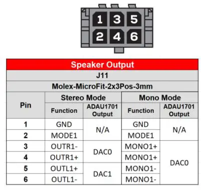 - Mixing – By default, input from I2S (Bluetooth) and J5 (analog) are mixed together within the DSP before being sent for amplification. This allows for a smooth transition between aux and Bluetooth without the user needing to touch the speaker/amplifier. This can be reprogrammed via a custom SigmaStudio project. For example, you might use a switch to change between Bluetooth and AUX (analog). See the example projects pack for an example SigmaStudio project