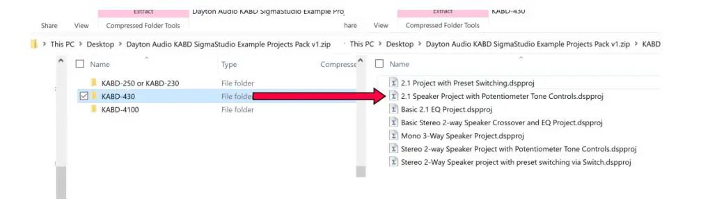 - Open an example project from downloadable from the Parts Express product page for the KABD430. (The example projects are in a zip file, and arranged into folders for each KABD type)