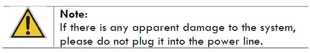 Unpack the equipment carefully and check for any damages which may have arisen during the transport. Please contact the manufacturer/supplier for technical support.