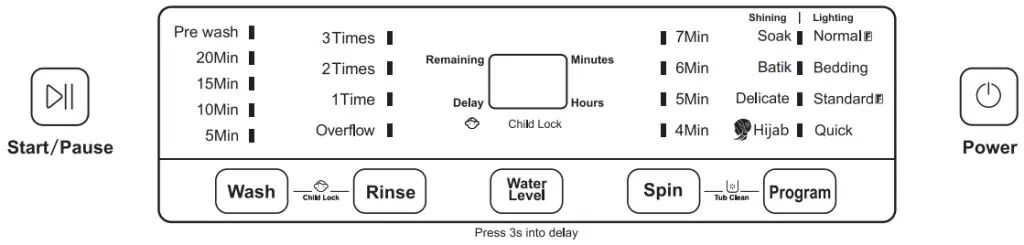 Tub Clean | You can use this function to clean the inner tub and outer tub of washing machine. Spin alternately, and the total soak time is 10 hours to make sure better clean effect. Do not put clothes during the tub clean process. |