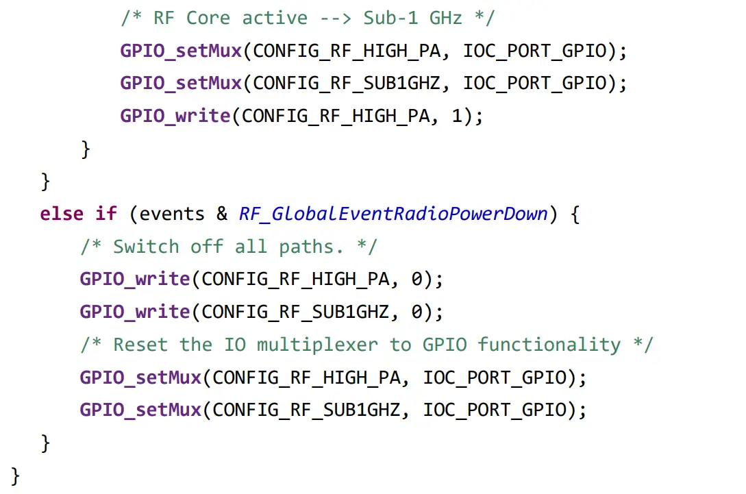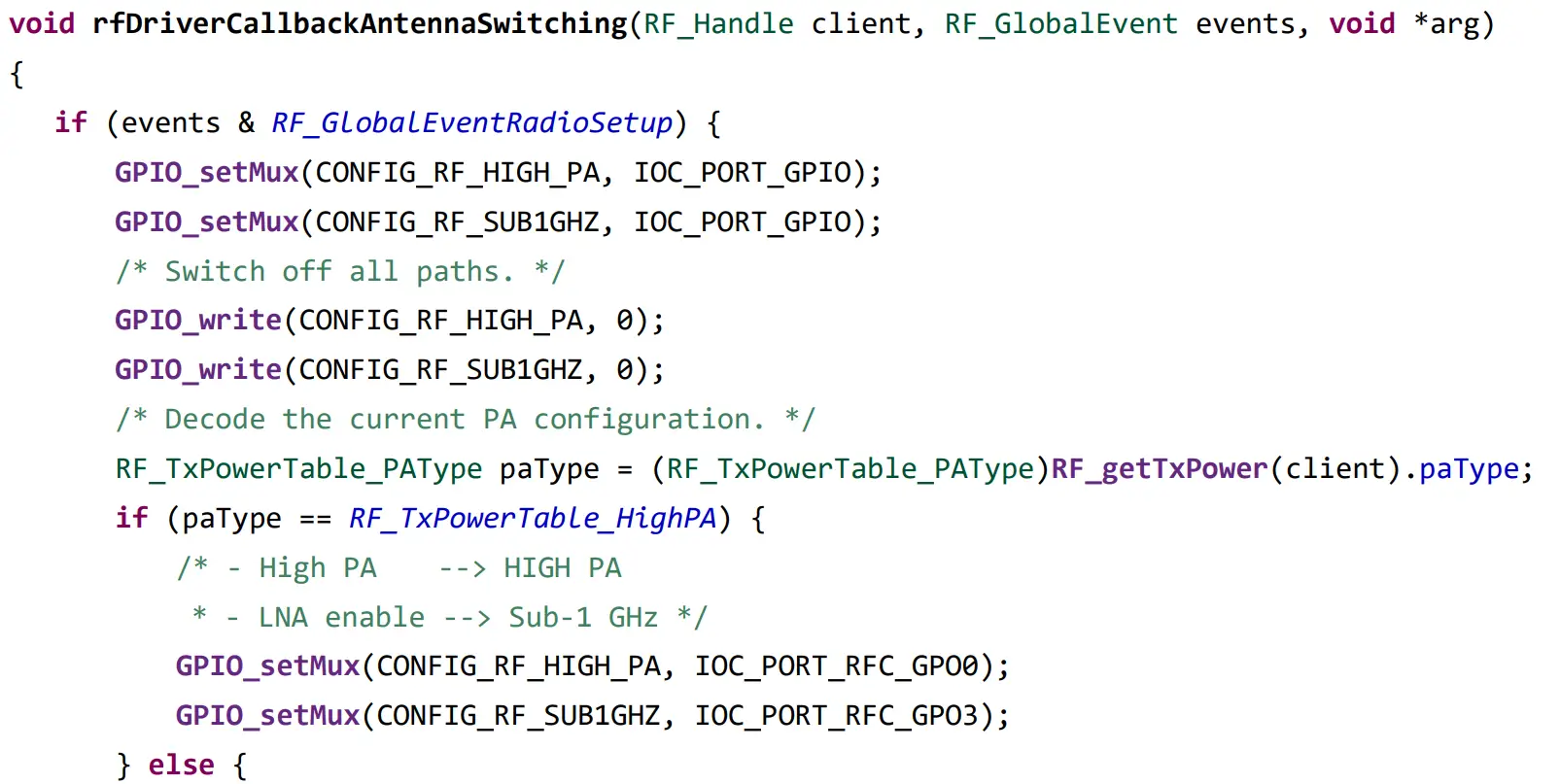 If the default antenna switch setting is used, the actual transmitted power will be very low when PA function is turned on. To avoid this kind of situation, user can refer to the following code in the main program rewriting rf Driver Callback Antenna Switching() function. The prototype of the function is in ti_ drivers_ config. c.