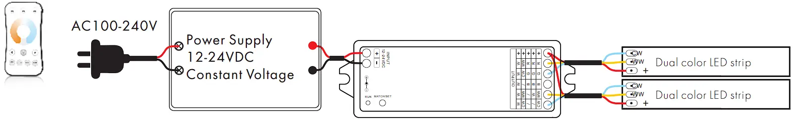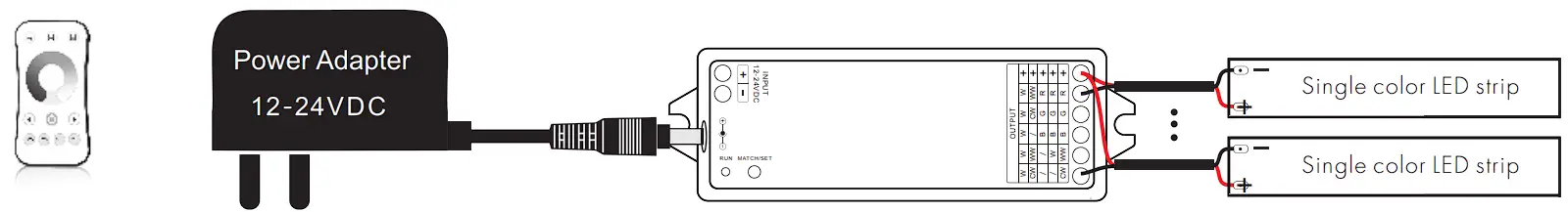 Press and hold match/set key for 10s, until the RUN LED indicator turn yellow, then release, the controller will become CCT type, then do smart config by tuya APP, or short press match key to match with CCT RF remote. - For single color