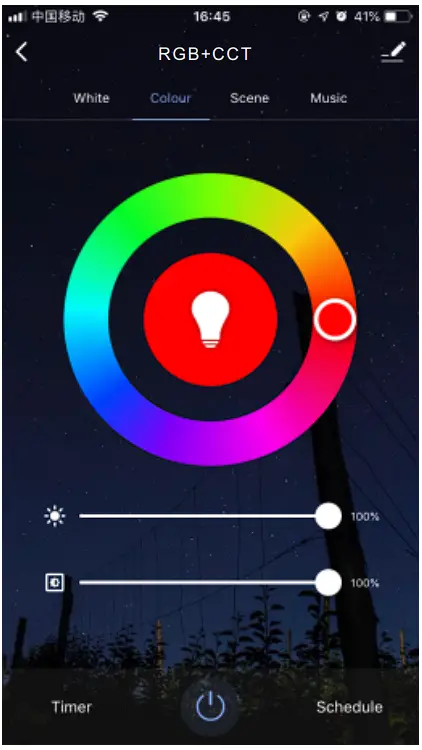 Touch color wheel to adjust static RGB color, WW/CW will turn off automatically.