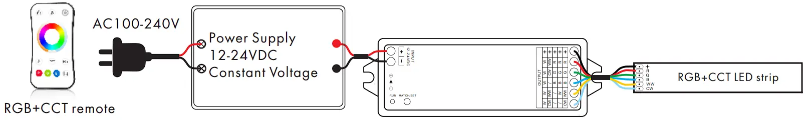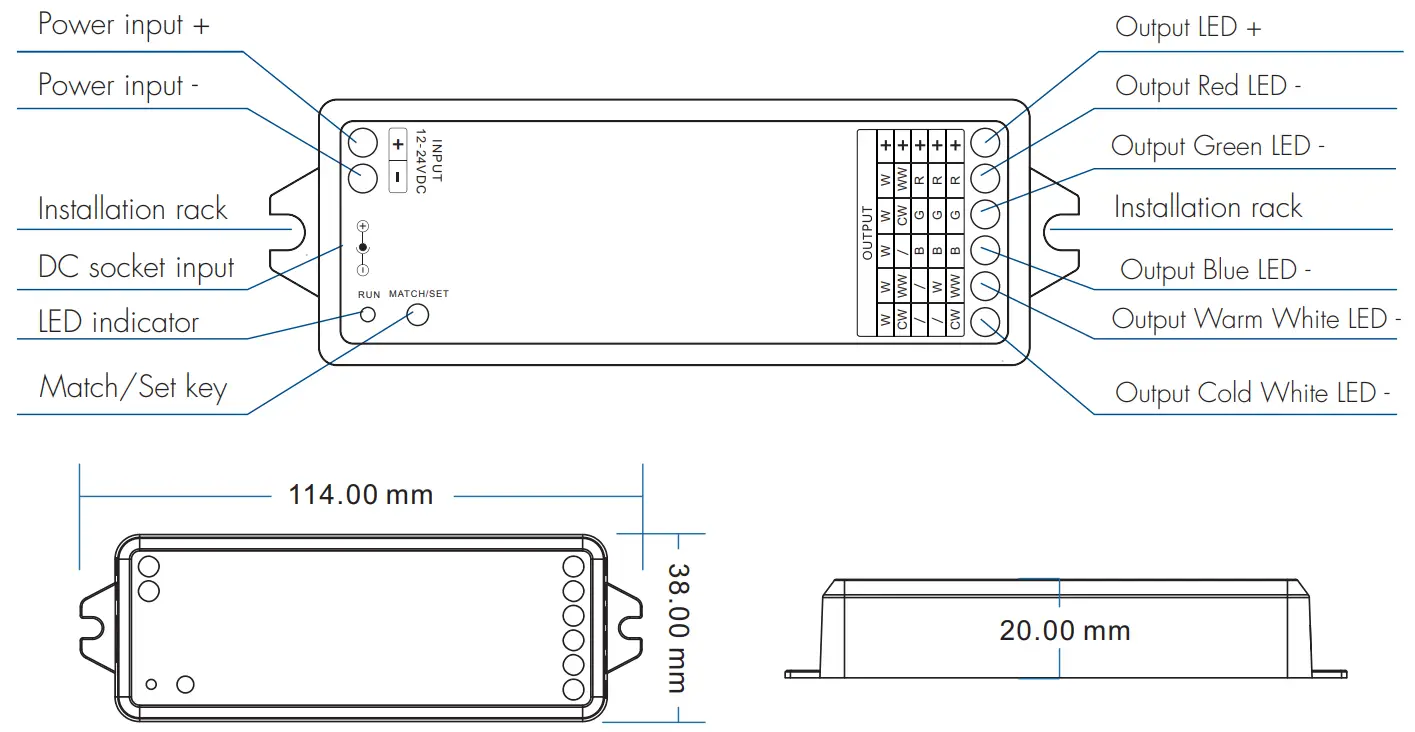 - 5 in 1 function, used for control RGB, RGBW, RGB+CCT, color temperature or single color LED strip.