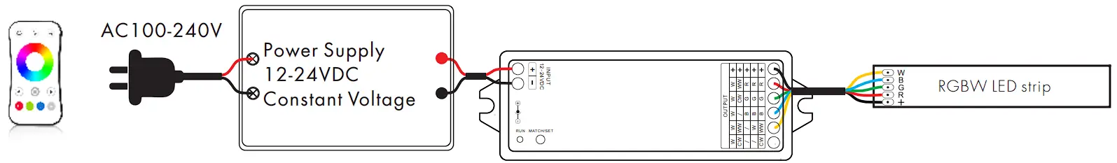 Press and hold match/set key for 16s, until the RUN LED indicator turn blue, then release, the controller will become RGB+CCT type, then do smart config by tuya APP, or short press match key to match with RGB+CCT RF remote. - For RGBW