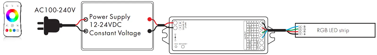 | Match: Short press match key of the controller, immediately press on/off key on the Tuya APP. The LED indicator fast flash a few times means match is successful. | Match: Switch off the power of the controller, then switch on power, repeat again. Immediately short press on/off key 3 times on the Tuya APP. The light blinks 3 times means match is successful. |