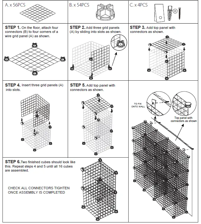 - STEP 1. On the floor, attach four connectors (B) to four corners of a wire grid panel (A) as shown.