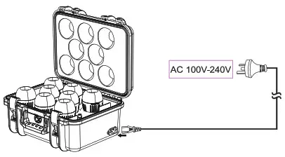 To charge the B7c bulbs using the charging case, plug the AC power cable into the case and a power outlet. Then ensure that the power switch is in the “ON” position. B7c bulbs can then be charged by inserting them into each of the “push-pull lamp sockets”