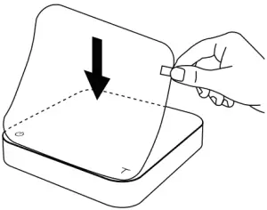 Align the film to the edge of the weighing platform. Then, while holding it in place, slowly apply the protective film, starting at one edge and moving to the opposite edge. It helps to use a straight edge (e.g., a credit card) to apply even pressure across the film.