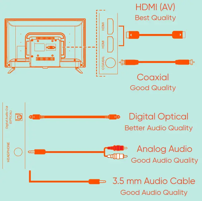 After connecting all your devices, connect the power cord to a power outlet. The TV enters standby mode and its indicator light turns red. *Actual placement of TV ports may vary by model.