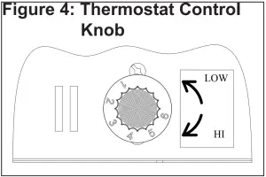 - Heater is equipped with a thermostat. To adjust temperature to your individual requirements, turn thermostat control knob clockwise all the way to turn heater on. When room reaches desired temperature, turn thermostat knob counter clockwise until you hear a click. Leave in this position to maintain room temperature at this setting. For additional heat, turn clockwise until you hear a click again and heater will turn on. To turn heater to lowest setting, turn thermostat knob counter clockwise all the way.