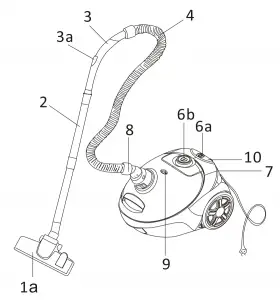 Connect the plug to a power socket. Turn on the vacuum cleaner with the switch button (6b).