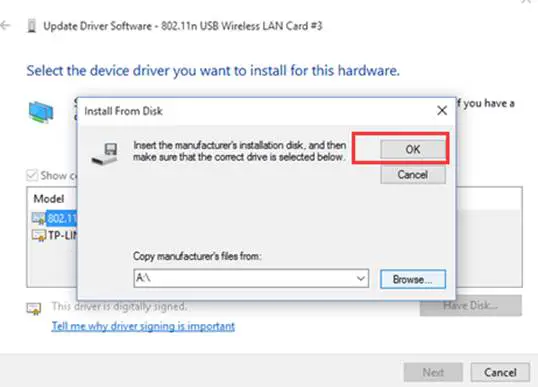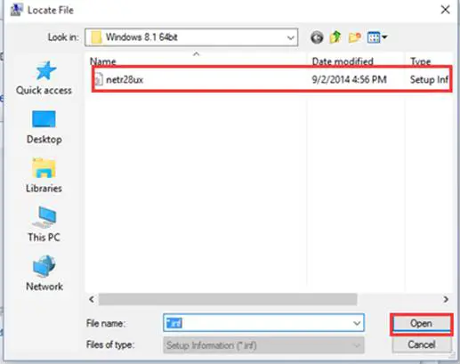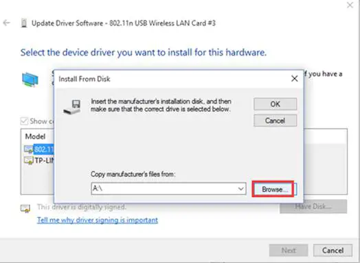 8. Click Browse and Open the inf file that you have already downloaded and extracted.